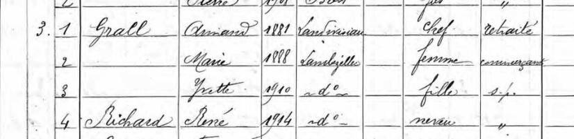 Pour le recensement de 1936 , il est noté enfant pour René né en 1920 . René devait donc habiter avec sa tante qui s'était remarié , je suppose avec Armand GRALL .